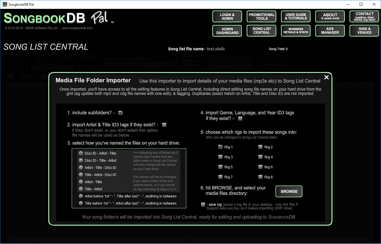 Quick Overview: the idea is to create ONE song list file (made up of up to 8 rigs), which you open in Song List Central whenever you want to add new songs to your list ie there's no need to create a new file whenever you add new songs. Once you've imported your new songs into that list (we'll go over the different import methods further down), hit the UPLOAD button and your songs will be live on the SongbookDB network.