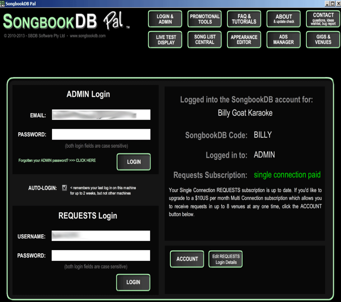 We keep Admin and Requests logins separate so that if you have multiple DJs in your company, they can receive requests at gigs but not access your Admin.